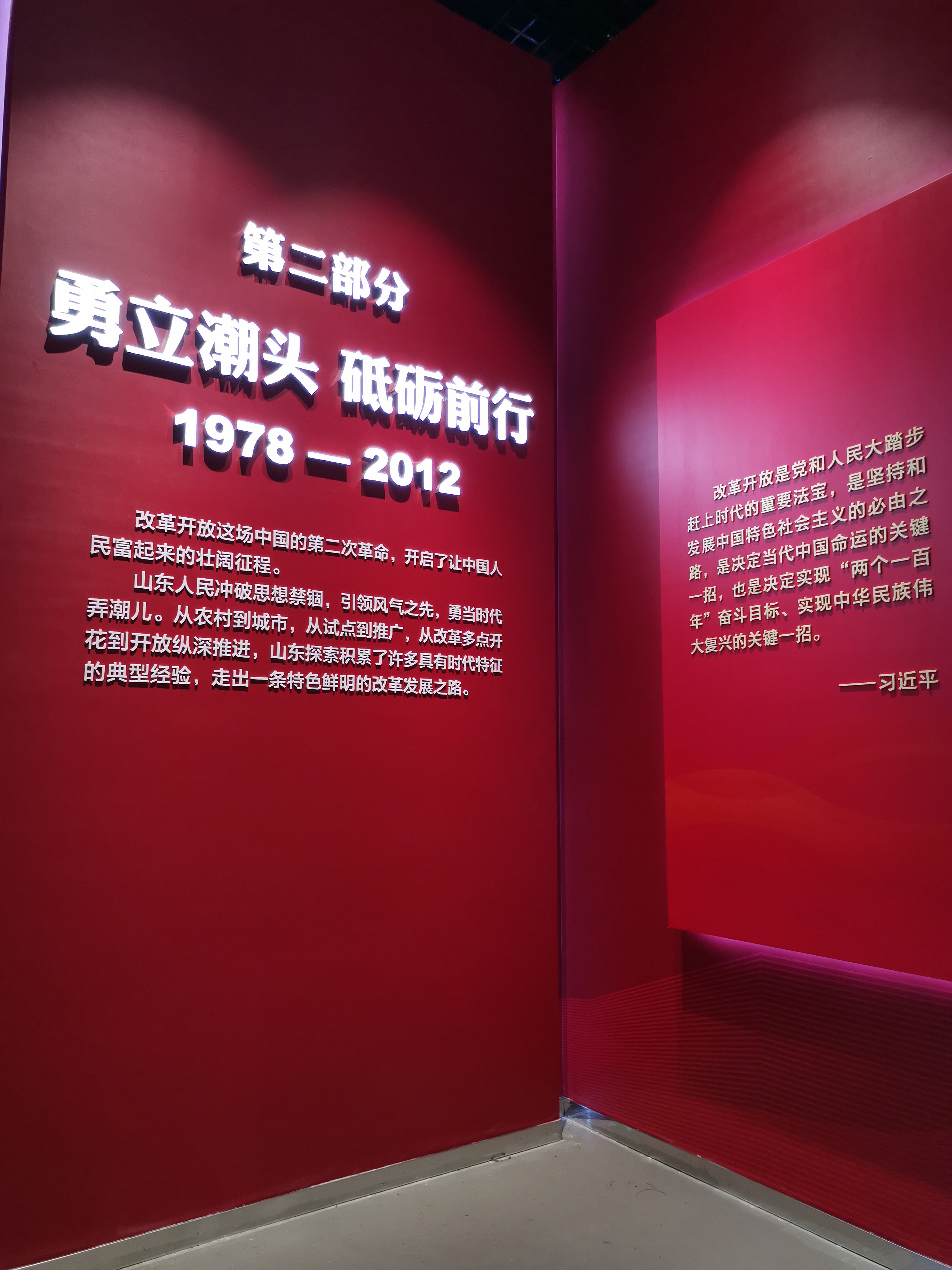 奮進的山東——慶祝中華人民共和國成立70周年成就展”以“奮進的山東”為主題,以時間為脈絡(luò),以1949年新中國成立、1978年實行改革開放、2012年黨的十八大召開三個重要時間節(jié)點,分為“百廢俱興 艱苦創(chuàng)業(yè)”“ 勇立潮頭 砥礪前行”“走在前列 全面開創(chuàng)”三個部分,集中展示新中國成立70年來,特別是黨的十八大以來,我省在政治建設(shè)、經(jīng)濟建設(shè)、文化建設(shè)、社會建設(shè)、生態(tài)文明建設(shè)和黨的建設(shè)等各方面取得的輝煌成就,激勵全省人民更加緊密地團結(jié)在以習(xí)近平同志為核心的黨中央周圍,不忘初心,牢記使命,奮力推動我省在全面建成小康社會進程中走在前列,在社會主義現(xiàn)代化建設(shè)新征程中走在前列,全面開創(chuàng)新時代現(xiàn)代化強省建設(shè)新局面。